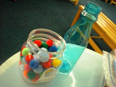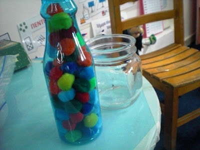 • Τέλος δοκίμαζω και με τα πον πον. 50 στο μπουκάλι και τα ίδια 50 βάζω και στο βάζο. Που είναι περισσότερα; Πάλι διαφωνία. Από εκεί όμως άρχισε να ξετυλίγεται το μυστήριο. Τα βοήθησε ο ίδιος αριθμός. Γιατί τα μετρήσαμε: 50 εδώ 50 κι εκεί.