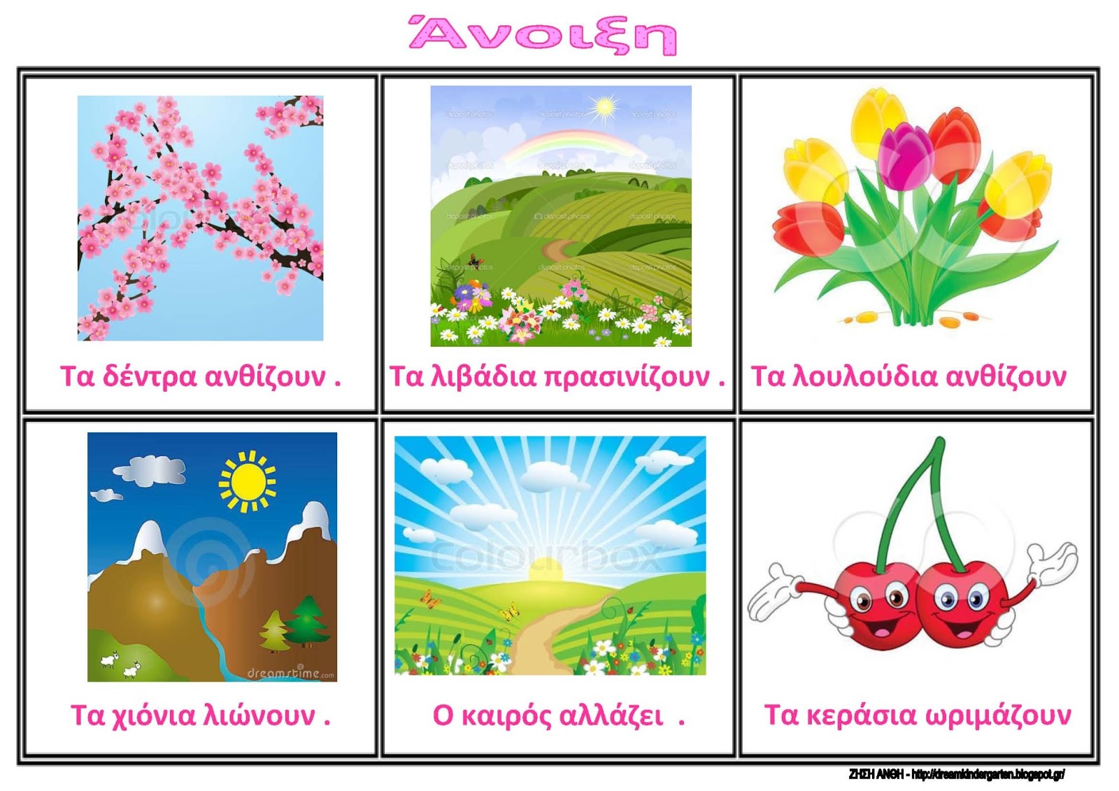 Oι μήνες της άνοιξης είναι: ο Μάρτιος, ο Απρίλιος και ο Μάιος. Αυτή την εποχή η φύση ολάνθιστη και καταπράσινη γιορτάζει τον ερχομό των χελιδονιών. Οι κήποι με την ευωδιά και τα χρώματά τους, καλούν τις μέλισσες και τις πεταλούδες να φτερουγίσουν πάνω από τα λουλούδια και τις πρασινάδες. Τα δέντρα πλημμυρίζουν από ανθάκια και στα κλαδιά τους κελαηδούν χαρούμενα πουλάκια. Ο παγωμένος αέρας του χειμώνα, γίνεται δροσερό αεράκι και η αγριεμένη θάλασσα ησυχάζει.