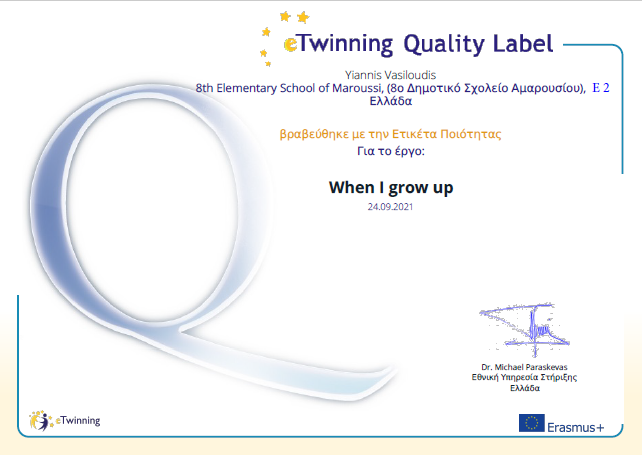 Μετά την εθνική ετικέτα ποιότητας για την εργασία του τμήματός μας στο έργο eTwinning “When I grow up“, σε συνεργασία και με άλλα ευρωπαϊκά σχολεία, το σχολείο μας βραβεύθηκε και με την Ευρωπαϊκή Ετικέτα Ποιότητας. Έτσι λοιπόν, η εργασία των μαθητών και του σχολείου μας έχει αναγνωριστεί στο υψηλότερο Ευρωπαϊκό επίπεδο.